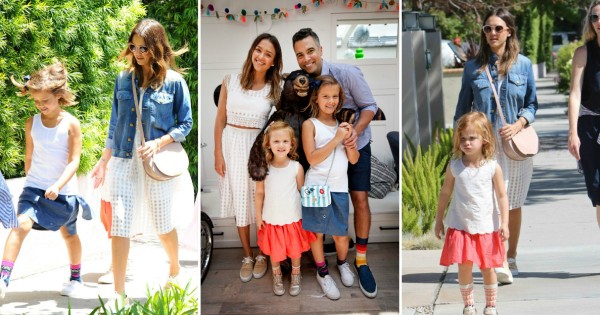 Алба шармираше во лежерна бела комбинација со патики. 4-годишната Хевен и 7-годишната Хонор со широки насмевки позираа со своите славни родители пред фотографите.