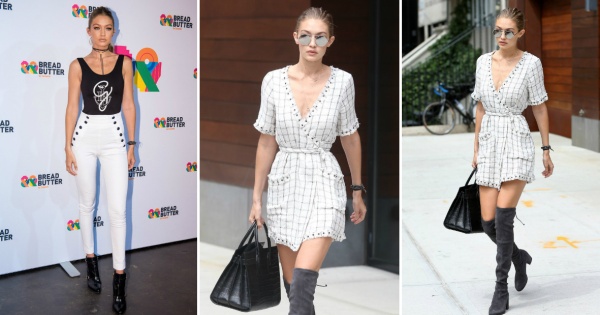 Низ улиците во Големото јаболко, Хадид чекореше во краток фустан на преклоп, кој го искомбинира со чанта од Сен Лоран и чизми до над колена од Стјуарт Вајцман.