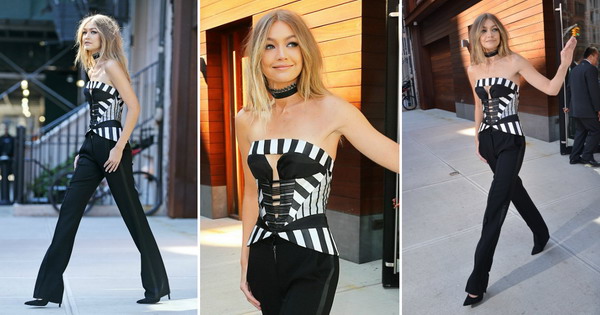 Додека се упатуваше кон студиото за снимањето на вечерното шоу на Џими Фелон, Хадид беше фотографирана во црно-бел аутфит кој вклучуваше корсет од Рубин Зингер.