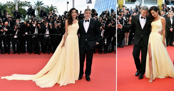 На премиерата на новиот филм на Џорџ, „Money Monster“, Амал се појави во нежен фустан со висок шлиц од италијанската модна куќа Версаче.