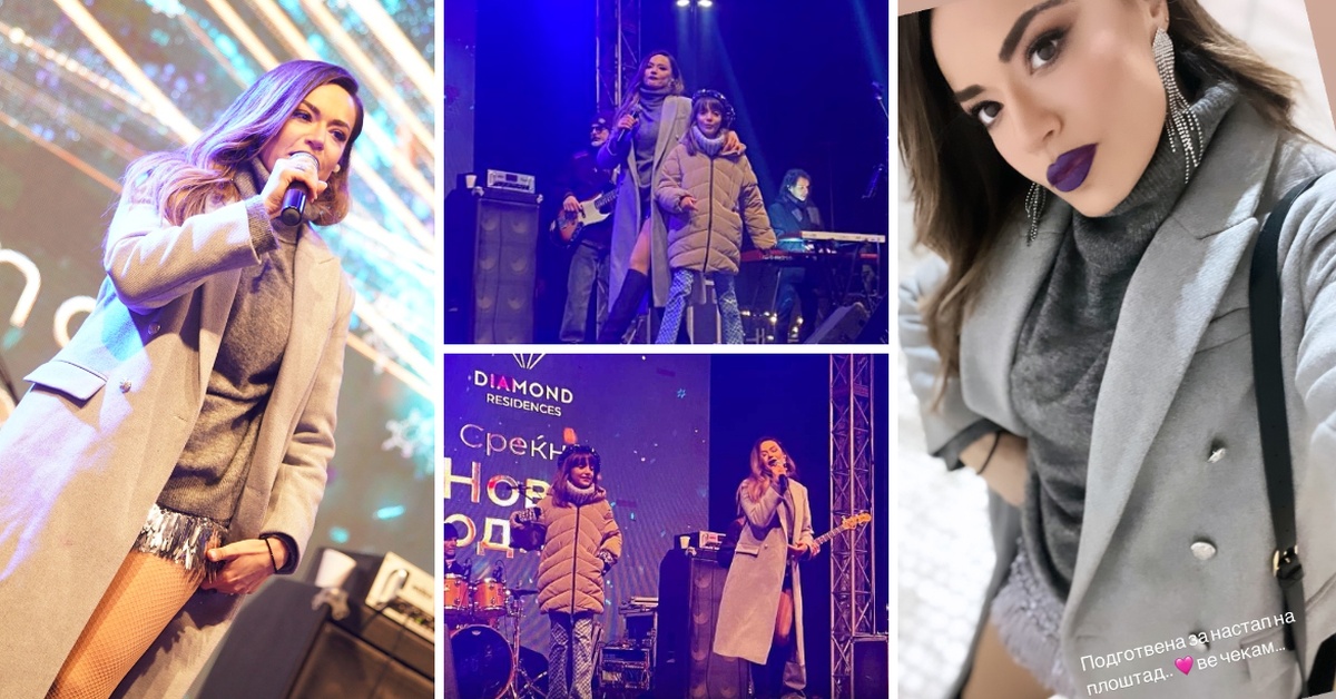 37-годишната пејачка во сива модна комбинација настапи на сцената на плоштадот Македонија, каде во еден момент ѝ се придружи внуката Делфина.