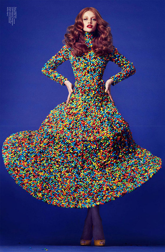Моделите позираа за Јун во фустани направени од M&M бонбони, лименки од Coca Cola (диетална), плишени мечиња, iPad-ови, кутии од прашок за перење...