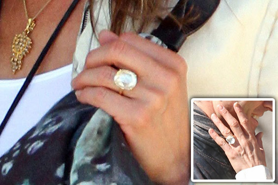 Џенифер Анистон не успеа да го сокрие големиот свршенички прстен. Додека си разменуваше нежности со својот свршеник Џастин Теру, славната актерка го покажа големиот камен.