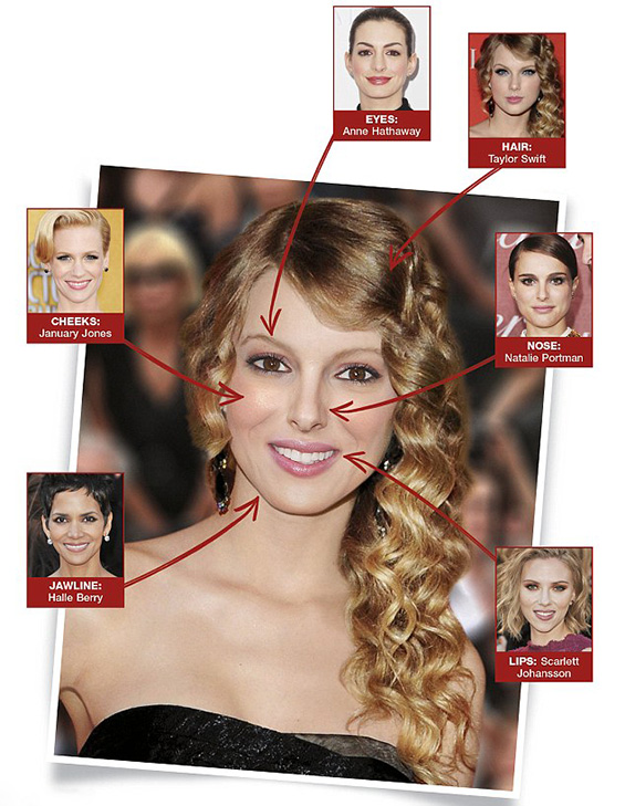 Користејќи податоци од побарувањата кај пластични хирурзи во изминативе 12 месеци, списанието создаде фотографија на жена која ги има очите на Ен Хетавеј, образите на Џенуари Џонс, носот на Натали Портман, брадата на Хали Бери, усните на Скарлет Јохансон и косата на Тејлор Свифт.