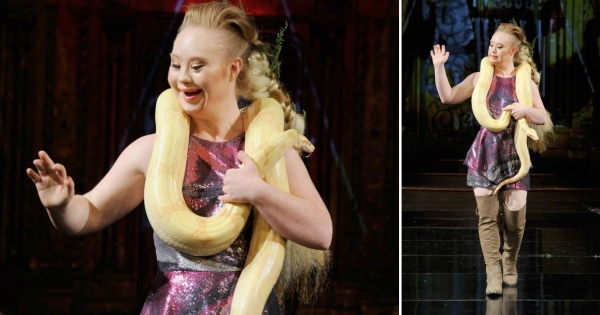 Медлин привлече огромно внимание откако на пистата се појави со огромен питон околу вратот.