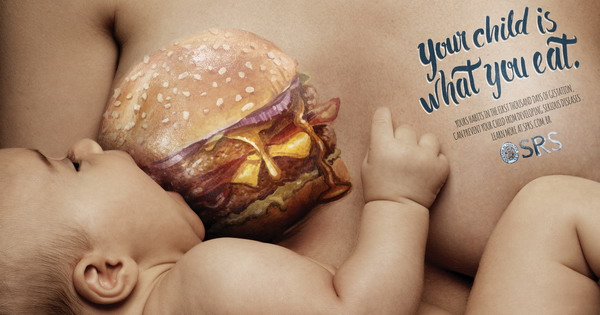 На фотографиите, создадени за Бразилската педијатриска асоцијација, се прикажани бебиња кои цицаат од градите на своите мајки. На градите на трите мајки е нацртан по еден нездрав производ – чизбургер, крофна и газиран сок – а бебињата се фотографирани така што наликува како да консумираат од нив.