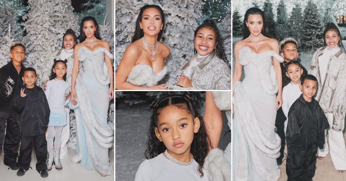 Пред празничната забава организирана од нејзиното семејство, 43-годишната ријалити ѕвезда позираше со своите четири деца кои ги има со поранешниот сопруг Кание Вест. Таа беше облечена во син фустан со крзно. Нејзините ќерки Норт и Чикаго исто така носеа светли комбинации додека синовите Сент и Псалм имаа црни стајлинзи.