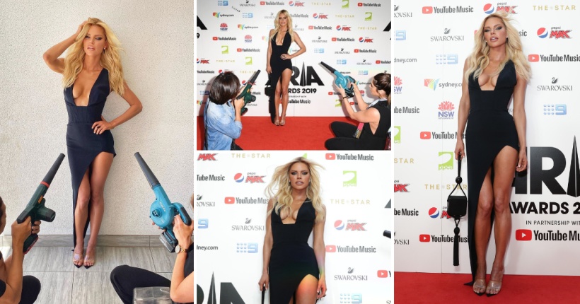 Покрај тоа што мамеше погледи со провокативниот стајлинг, 39-годишната пејачка и актерка, за да постигне погламурозен изглед, на црвениот тепих се појави со двајца асистенти кои со дувалки за лисја ѝ ја развејуваа косата.