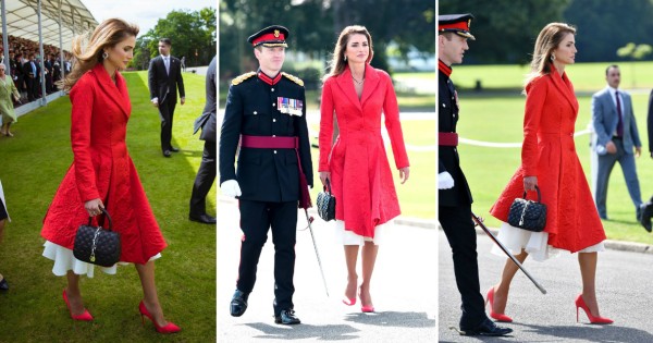 Модерната сопруга на јорданскиот крал Абдула II мамеше погледи во впечатливо палто во жешка црвено-портокалова нијанса и ускладени салонки. Малата црна чантичка го носи потписот на Луј Витон.
