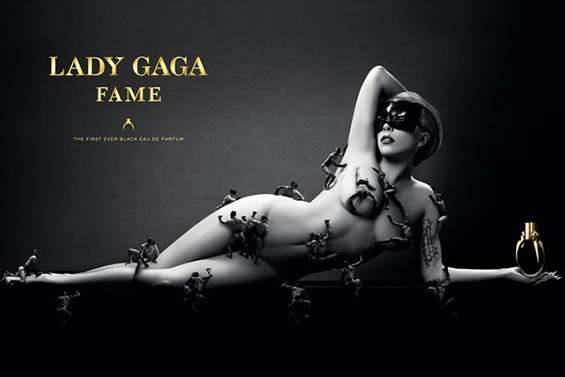 Лејди Гага ја објави печатената реклама за својот прв парфем „Fame“. На фотографијата провокативната пејачка е целосно гола, а врз нејзиното тело се искачуваат минијатурни мажи.