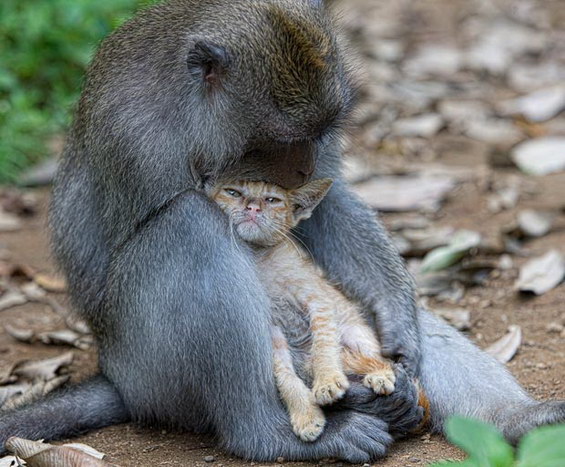 Ен Јанг со својот фотоапарат успеала да направи неверојатни фотографии од млад мајмун којшто заштитнички чувал мало маченце во Бали, Индонезија.