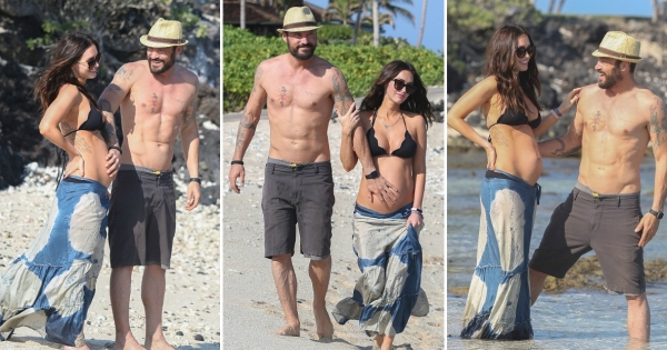 Холивудските ѕвезди беа фотографирани додека уживаа на песочните плажи на Хаваи. На две фотографии, Брајан грижливо го гали стомачето на Меган.