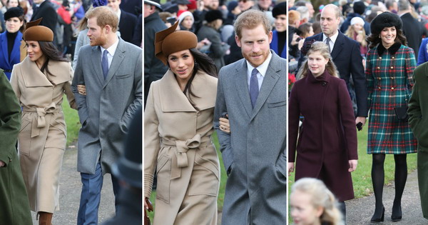 Бремената Кетрин носеше карирано палто, додека Меган избра светло бежово палто во комбинација со шапка и чизми во кафеава боја.
