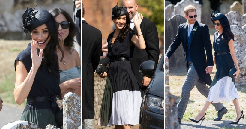 Војвотката од Сасекс носеше колор-блок фустан од бендот Club Monaco и обувки од Aquazzura.