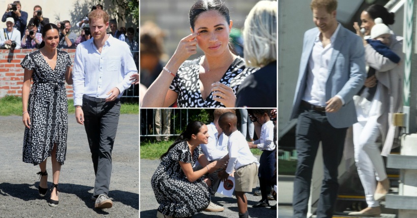 ФОТО: Меган Маркл во црно-бел фустан на преклоп откако допатува со бебето Арчи и принцот Хари во Јужна Африка
