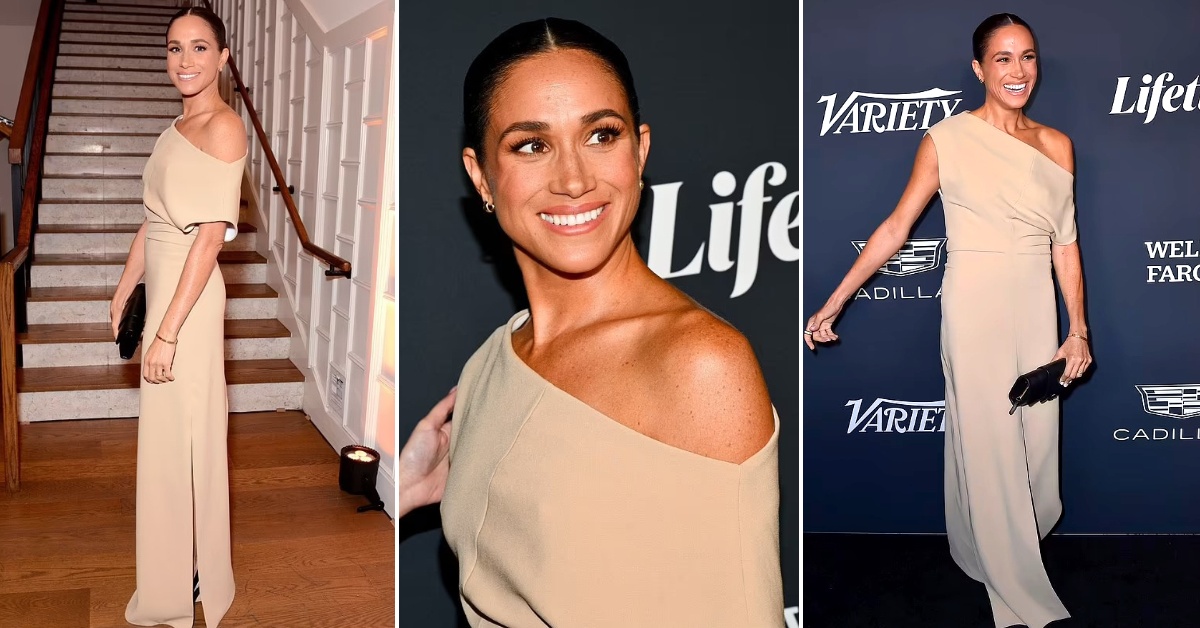 42-годишната војвотка од Сасекс присуствуваше на овогодишната гала „Моќта на Жените“ организирана од Variety. На црниот тепих во Лос Анџелес, Меган се појави во бежов долг фустан на едно рамо од брендот Proenza Schouler, кој чини речиси 1.400 долари. Својот изглед таа го надополни со чантичка од истиот бренд и обувки од Aquazzura.