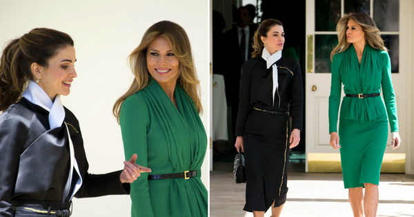 46-годишната прва дама на САД блесна во смарагдно-зелен фустан со тенко коланче на половината и црни обувки од Кристијан Лобутин, додека 46-годишната кралица на Јордан избра црно-бел стајлинг со златни детали.