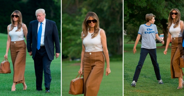 Славното трио беше фотографирано додека слегуваше од авион и на тревникот на Белата куќа. Меланија носеше бела маичка од Dolce & Gabbana, панталони од Bally и чанта Hermes Birkin.