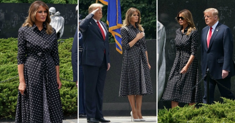 За оваа пригода, 50-годишната прва дама на САД избра кошула-фустан со точкест принт од Росета Гети. Својот моден избор Меланија го надополни со бели салонки од Маноло Бланик.