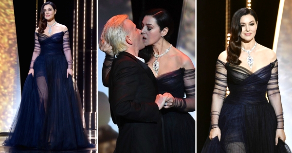 На сцената, 52-годишната италијанска убавица блесна во креација од Диор. Како дел од својот настап, таа страсно го бакна 38-годишниот водител Алекс Лиц пред премиерното прикажување на филмот „Ismael’s Ghosts“.