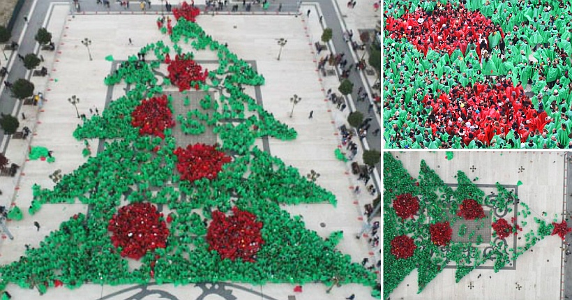 Облечени во зелени и црвени најлонски наметки тие оформија огромна елка. На овој интересен потфат присуствуваше и градоначалникот Петре Шилегов.