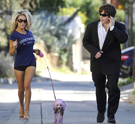 Облечена во прекратки панталончиња, Кортни трчаше заедно со своето розово куче, додека маж што веројатно треба да е нејзин телохранител се обидуваше да го следи секој нејзин чекор.