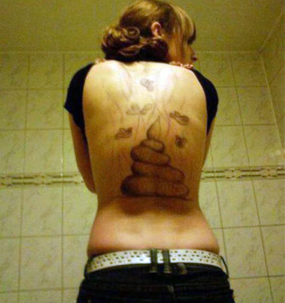 Веќе неколку дена на интернет кружи фотографија од жена на чиј грб има тетоважа од измет. Според неофицијалната вест која стотици сајтови ја објавија, Рози Бровент ја добила тетоважата од своето бившо момче како одмазда откако го изневерила, па таа го тужела и барала од него оштета од 100.000 долари.