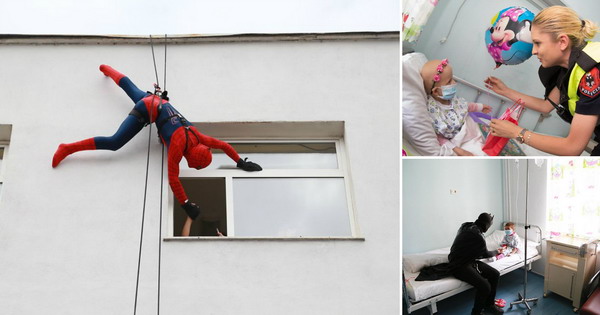 Маскирани како суперхерои, полицајците со јажиња се спуштија од покривот на здравствената установа и преку прозорците ги поздравија малите пациенти, им поделија подароци и им дадоа беџови со натпис: „Вие сте нашите херои“.