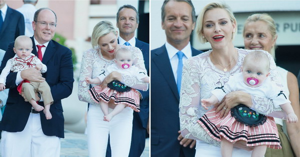 57-годишниот принц го држеше во своите раце малиот Жак, додека 37-годишната принцеза чекореше носејќи ја малата Габриела. Малите близначиња носеа облека која беше складна на костимите на учесниците во прославата.