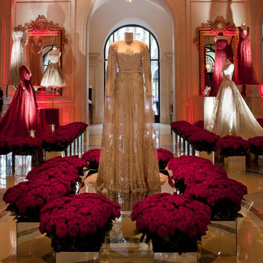 Придушената светлина и цветните аранжмани ја збогатуваат атмосферата и го потенцираат раскошот на рачно изработените фустани. Околу 20.000 црвени и бели рози се искористени за разубавување на лобито на хотелот.