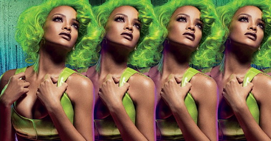 Ријана позира во зелен фустан и со зелена перика на промотивната фотографија за новите козметички производи – металик кармин и сјај за усни.