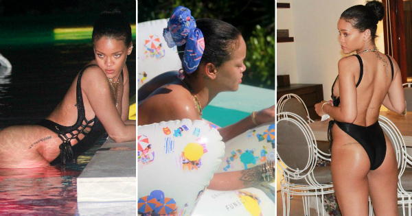 На дел од нив, 28-годишната ѕвезда од Барбадос позира во црн костим за капење пред објективот на своите пријателки, додека на други, Ријана во розови бикини се релаксира пловејќи во базен на голем надуен лебед.