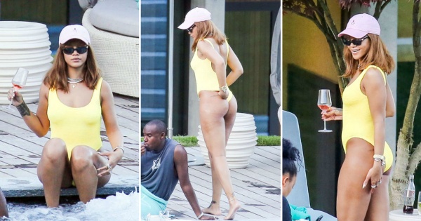 Облечена во жолт костим за капење од брендот Hunza G и спортска капа, Ријана со чаша вино во раката разговараше, се забавуваше и фотографираше со своите пријатели.