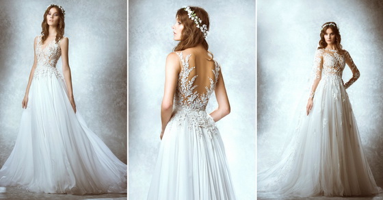 Раскошни ткаенини со комплексни везови и деликатни апликации, елегантни силуети и сексапил изразен преку транспарентност стојат во основата на белата колекција.