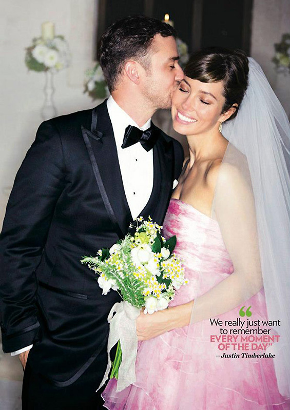 Џесика Бил блеска од среќа на фотографиите од свадбата со Џастин Тимберлејк. За свадбената церемонија 30-годишната актерка избра розов фустан од Џамбатиста Вали, а единственото нејзино барање било фустанот да зрачи со „романтика, романтика, романтика“.