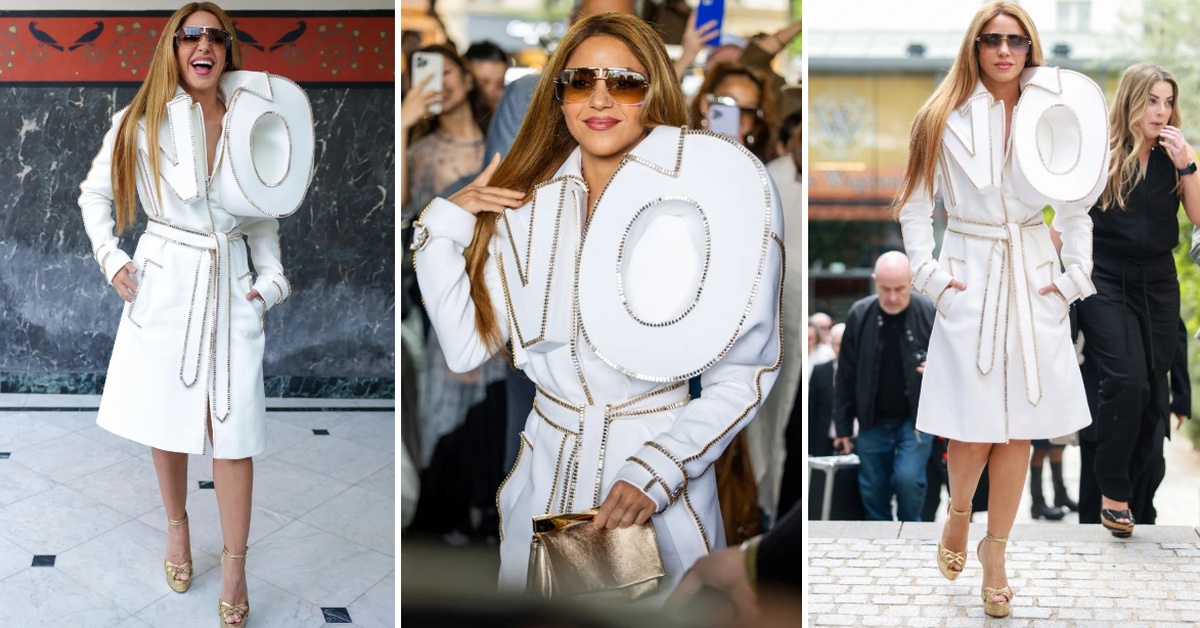 46-годишната музичка ѕвезда изгледаше шик во бела креација со златни детали од францускиот бренд. Впечатливиот мантил беше надополнет со тродимензионален натпис на кој пишуваше „НЕ“ (NO).