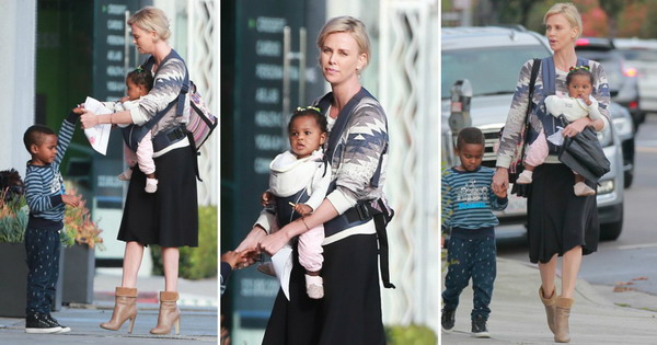 На фотографиите, ѕвездата од „Mad Max: Fury Road“ грижливо ја носи малата ќерка Огуст, додека покрај неа се движи нејзиниот четиригодишен син Џексон.