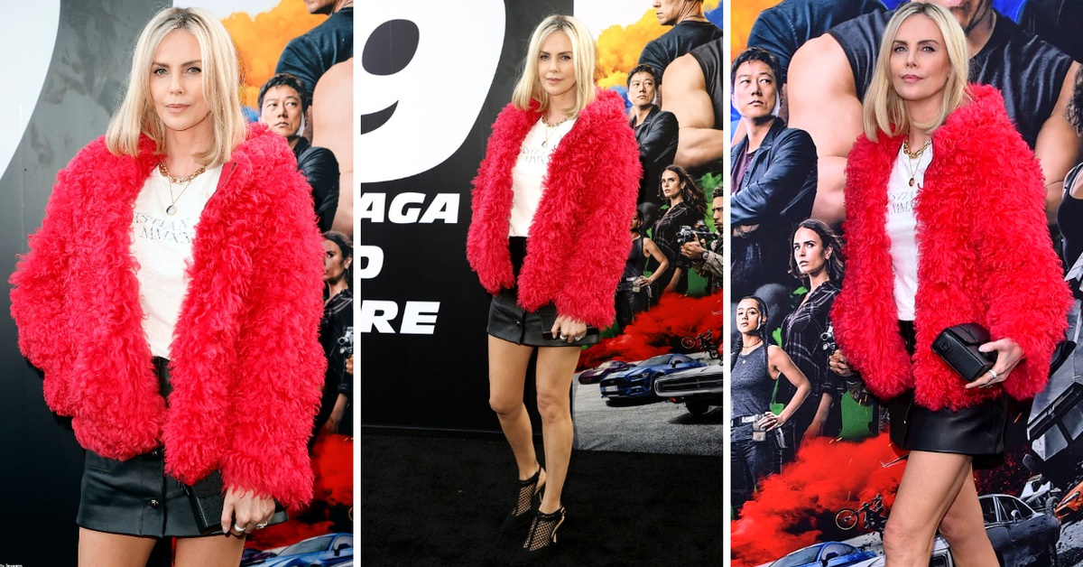 На премиерата во Лос Анџелес, 45-годишната филмска ѕвезда се појави во шик комбинација од Диор, која вклучуваше кожно мини здолниште и црвена бунда.