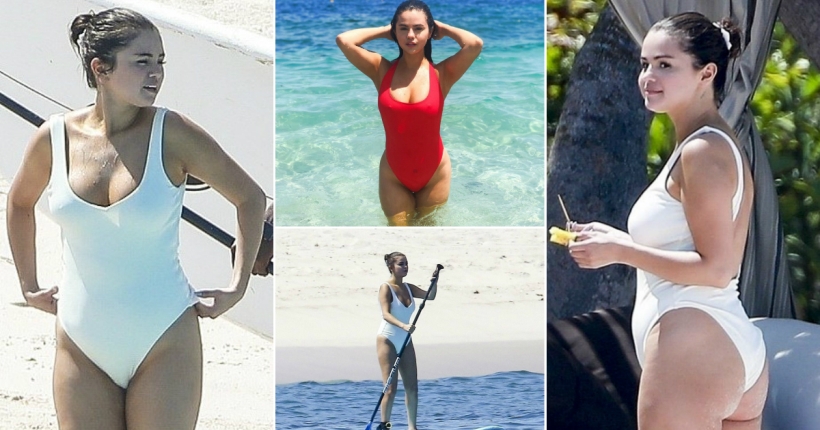 Славната пејачка и актерка беше фотографирана во бел и црвен едноделен костим за капење додека со широка насмевка се дружеше со блиските.