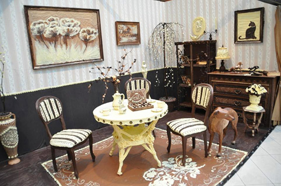 Слатката просторија ја изработила скулпторката Елена Климент, а притоа потрошила 420 килограми темно, млечно и бело чоколадо. За една недела таа успеала да создаде 54 различни предмети од кои се навлажнува устата.