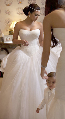 На фотографиите јасно се гледаат фустаните на Ким, создадени од легендарната креаторка Вера Ванг, а исто така и накитот кој чинел 10 милиони долари.