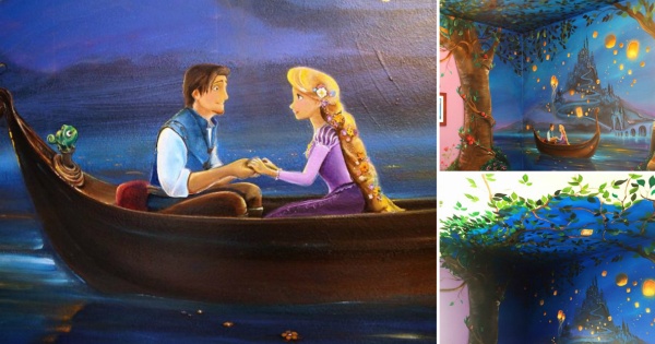 Џенифер Тејс на ѕидот ја наслика најпознатата сцена од цртаниот филм, на која Златокоса и Флин Рајдер се возат во дрвен чамец и ги гледаат запалените фенери кои летаат кон небото.