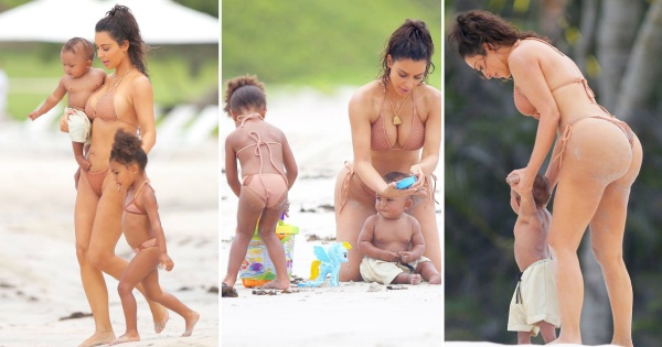 Ким Кардашијан со своите две деца ужива во Мексико. 35-годишната ѕвезда од шоуто „Keeping Up with the Kardashians“ беше фотографирана по бикини заедно со ќеркичката и синчето на плажа во Пунта Мита.
