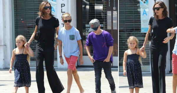 Облечена во свои креации, поранешната членка на Spice Girls ја водеше за рака 5-годишната Харпер, додека 11-годишниот Круз и 13-годишниот Ромео чекореа покрај нив.
