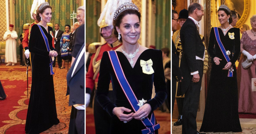 За свеченоста во Бакингемската палата, 37-годишната сопруга на принцот Вилијам избра кадифена креација од Александар Меквин и сребрен накит, кои ѝ припаѓа на кралицата. Големо внимание привлекуваше тијарата „Cambridge Lover’s Knot“, која ѝ беше омилена на принцезата Дијана.