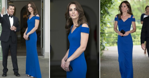Елегантниот фустан во кралско сина боја на Кетрин доаѓа од колекцијата ресорт 2016 на францускиот дизајнер Ролан Муре. Својот изглед, војвотката го надополни со сандали од Џанвито Роси и накит од Картие.