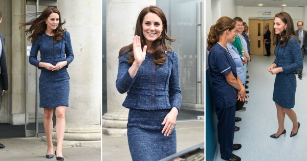 Елегантниот женски костум кој го носи Кетрин доаѓа од ателјето на модната дизајнерка Ребека Тејлор, а обувките се дело на Маноло Бланик.