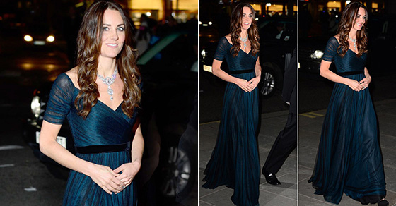 За свечениот настан, сопругата на принцот Вилијам избра елегантен фустан од својата омилена дизајнерка Џени Пекам. Кралскиот изглед на Кетрин беше комплетиран со дијамантски накит кој ѝ припаѓа на кралицата Елизабета.