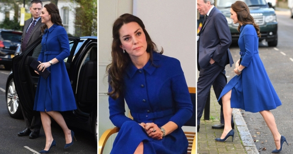 35-годишната сопруга на принцот Вилијам изгледаше елегантно во сино палто до колена од колекцијата есен/зима 2016 на Eponine, кое чини 1.900 евра. Својот изглед, Кетрин го надополни со тегет салонки од Руперт Сандерсон и чанта од Стјуарт Вајцман.