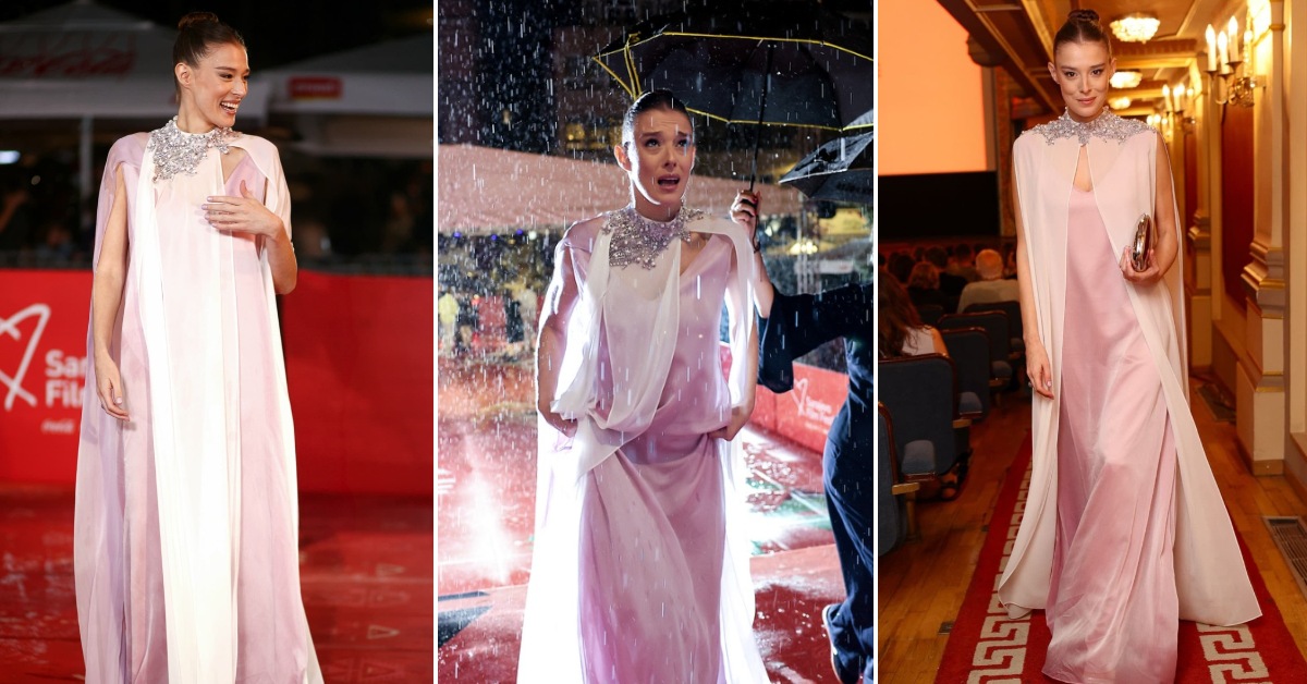 Младата актерка блесна во елегантна долга розова тоалета од Kaftan Studio. Фустанот беше надополнет со бела наметка со сребрени детали, сребрен накит, суптилна шминка и фризура пунџа.
